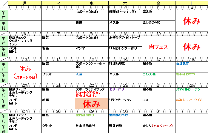 それ以外にも、野外活動ハロウィーンレク等この時期ならではの