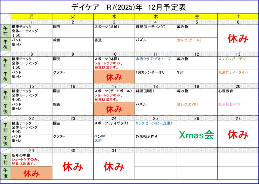 デイケアブログ・12月予定表