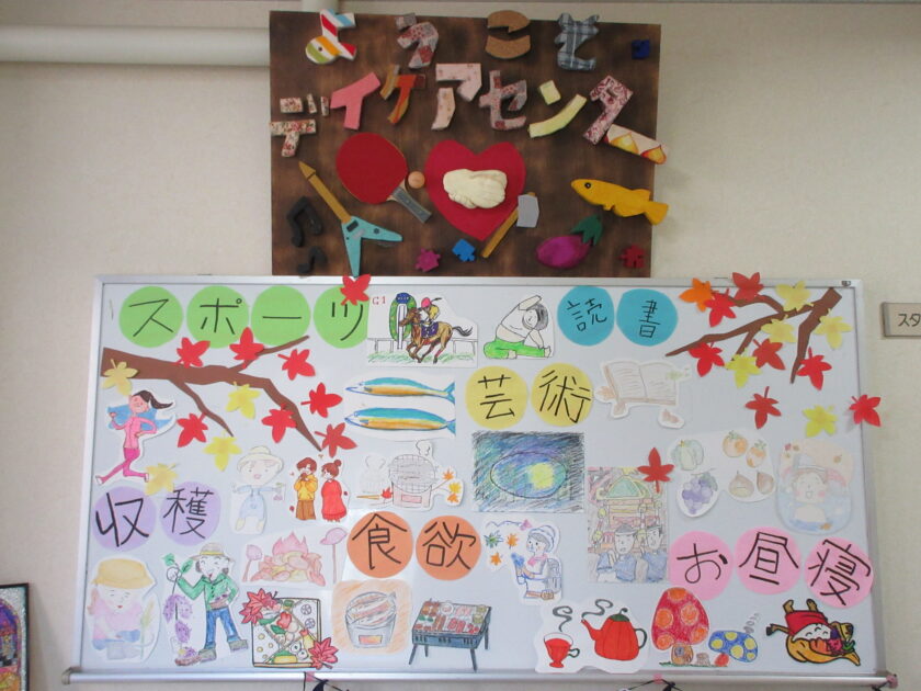 本日デイケアホール内の飾りを模様替え!『HAPPY FALL~秋を楽しもうよ!~』をテーマに、すっかり秋らしい空間へと様変わりしました。お部屋の中でも季節感を味わっていただけますと幸いです。